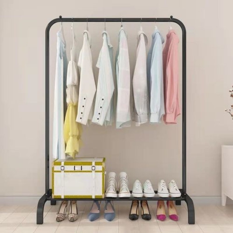 This static garment rack has anti-slip bead on both ends of the hanging rod to prevent the hangers falling down.The  bottom foot pad were wear-resistant anti-slip to protect the floor.: Made of premium metal, hooks this freestanding single rod garment rack is solid, hanging rod with stoppers on each side prevents clothes from falling.ADDED STORAGE: Bottom shelf gives the clothing rack added strength and stability, also provides off-the-floor space for shoes, boots, baskets and bags, umbrellasEASY TO ASSEMBLE: Comes with assemble instructions, assembling tool, easy to assembly, It's easy for everybody to install it.