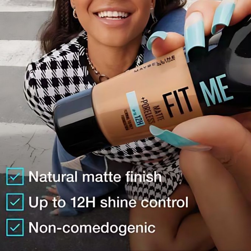 Fit Me Matte + Poreless Foundation face makeup. This lightweight foundation mattifies and refines pores, leaving a natural, seamless finish.