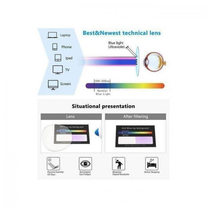 HOW TO PROTECT YOUR EYESBlue light blocking glasses from our store are specially designed to filter out harmful blue-violet light. This makes screen time more comfortable and help eliminate symptoms of digital eyestrain. Simultaneously, this Blu-ray filter glasses will improve your sleep and make you fall asleep.